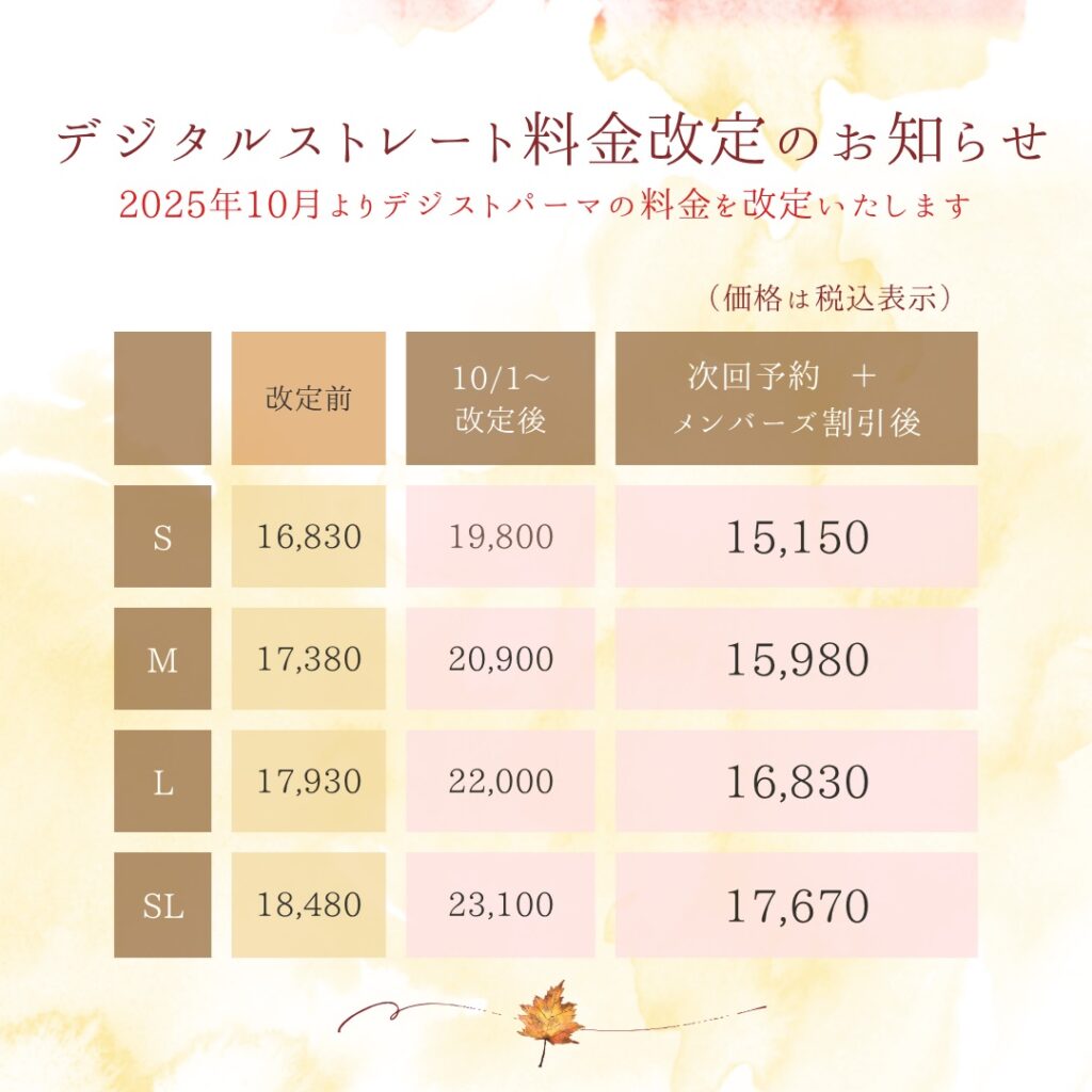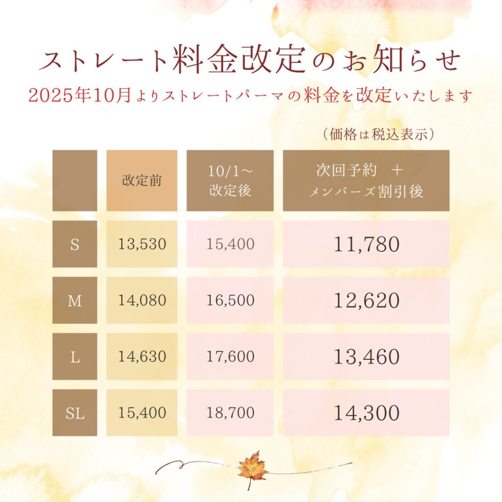 2025年10月より、ストレートパーマの料金を改定させていただきます。